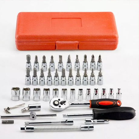 Un set de instrumente ar trebui să fie în arsenalul oricărui om. Acesta vine cu un clichet, o șurubelniță și o varietate de biți și mufe diferite. Setul conține o cutie de depozitare rezistentă, ceea ce ușurează transportul instrumentelor.
